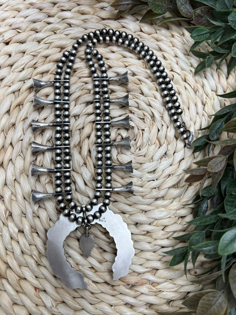 *** Squash blossom necklaces originated in the 19th century, blending Native American craft with Spanish influences. The Naja pendant was adapted from Spanish horse bridles, while the "squash blossoms" are silver beads resembling flower buds, symbolizing growth and fertility. Worn traditionally during important ceremonies, they represent wealth and status among Navajo, Hopi, and Zuni tribes. Today, they remain iconic symbols of Native American heritage, admired for their bold design and craftsmanship. ***