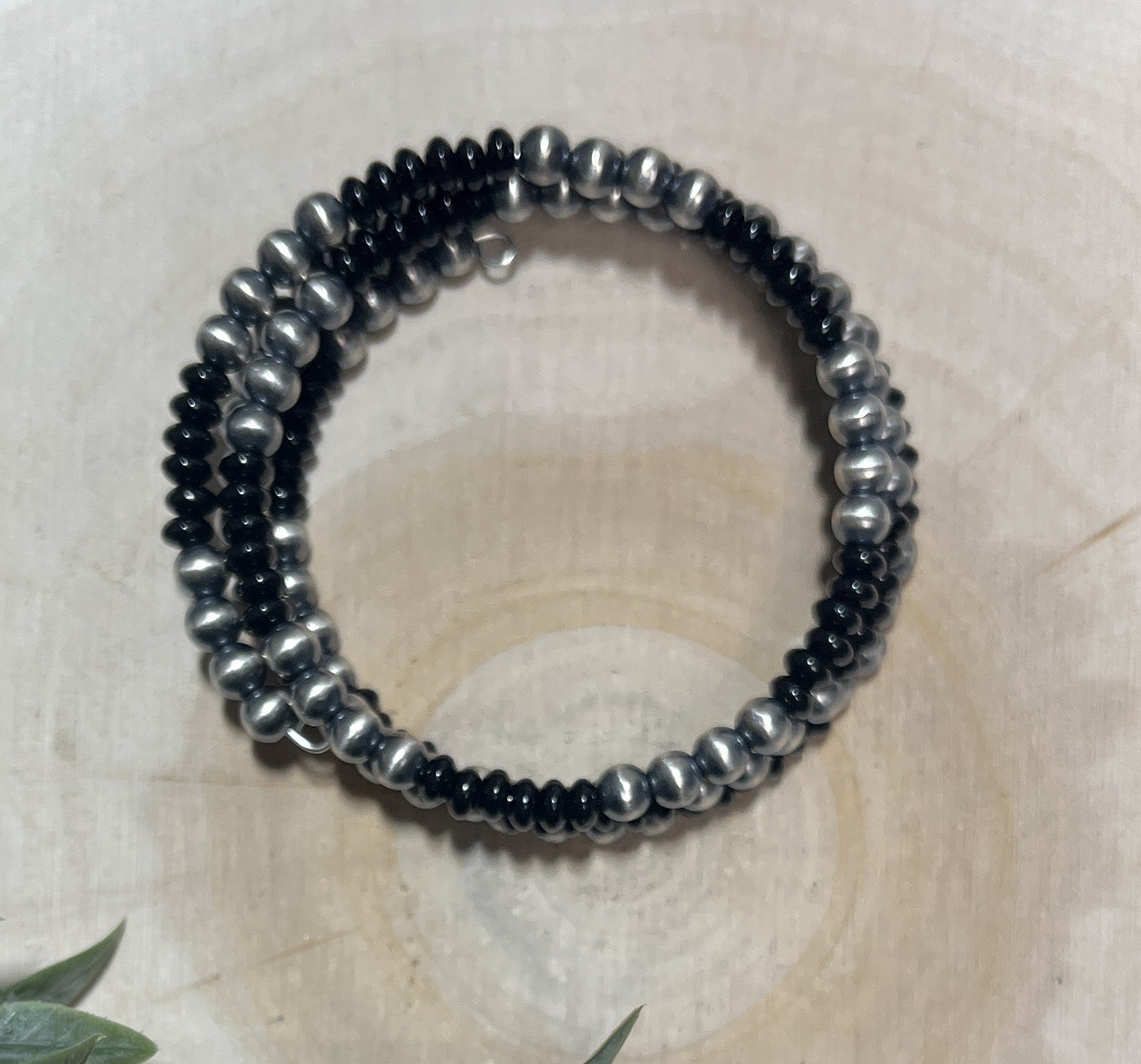 5mm Desert Pearls and Black Onyx 3-row Memory Bracelet