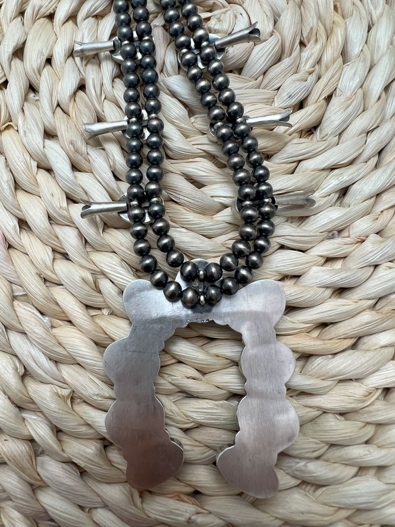 *** Squash blossom necklaces originated in the 19th century, blending Native American craft with Spanish influences. The naja pendant was adapted from Spanish horse bridles, while the "squash blossoms" are silver beads resembling flower buds, symbolizing growth and fertility. Worn traditionally during important ceremonies, they represent wealth and status among Navajo, Hopi, and Zuni tribes. Today, they remain iconic symbols of Native American heritage, admired for their bold design and craftsmanship. ***
